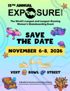 Exposure brings together rising stars, seasoned pros, skateboarding legends, and fans alike to share in the stoke and witness skateboarding history being made year after year. This event also serves as a benefit, with proceeds going towards programs and resources that support survivors of domestic violence.
