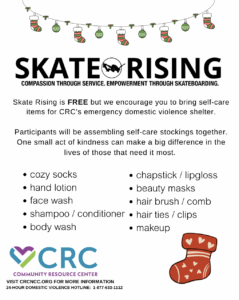 Join us for a FREE event for girls age 4-16 of all abilities! We will be providing learn-to-skate clinics at the new LVL Up facility taught by Olympians and Pros. The event will also teach compassion through service and engage participants in filling holiday stockings with self-care items for women housed at the Community Resource Center’s Domestic Violence Shelter.